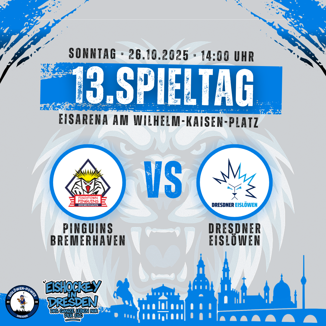 Am Sonntag, den 12. Oktober 2025, empfangen die Dresdner Eislöwen in der JOYNEXT Arena die Fischtown Pinguins Bremerhaven. Der Eröffnungsbully…